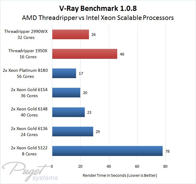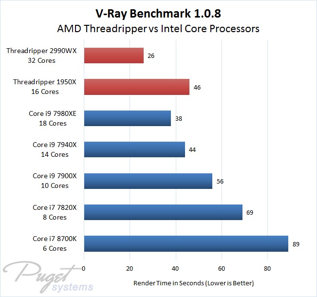 AMD's new Threadripper 2990WX gives an amazingly good performance in V-Ray! That first chart shows it taking 46% less time to complete a render compared to Intel's Core i9 7980XE, even though the 2990WX costs 10% less ($1799 vs $1999) than Intel's flagship. It also beats the previous-generation Threadripper 1950X by about 72%.