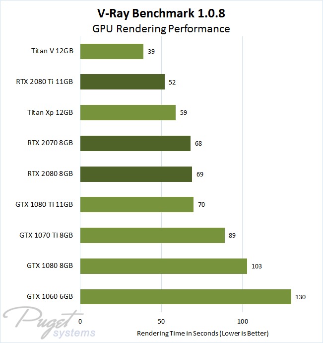 Here are the results, in seconds, from V-Ray Benchmark 1.0.8 (using V-Ray 3.57.01) for the different video cards we tested. The new GeForce RTX series cards are in a darker shade of green, to make it easy to pick them out: