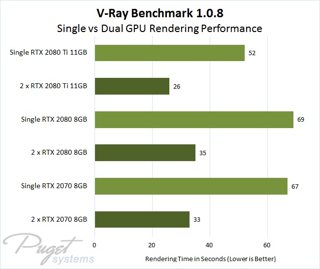 An interesting side note: on the 2080 and 2080 Ti, we ran the dual GPU tests both with and without SLI / NVLink enabled. In most programs where we have tried this, and where NVLink support was not present, performance actually went down – but in the V-Ray Benchmark, it was identical. Both pairs of cards took the exact same amount of time to render whether they were connected via SLI / NVLink or not… almost as if V-Ray just ignored that feature entirely. It could also be evidence that V-Ray is NVLink aware, but in that case I would have expected similar but slightly different performance – rather than exactly the same result, down to the second. Hopefully the next version of the V-Ray Benchmark will show a difference with NVLink, since that tech should be beneficial for rendering. The RTX 2070s do not support NVLink, so that is something which could potentially alter the performance landscape between them in the future.