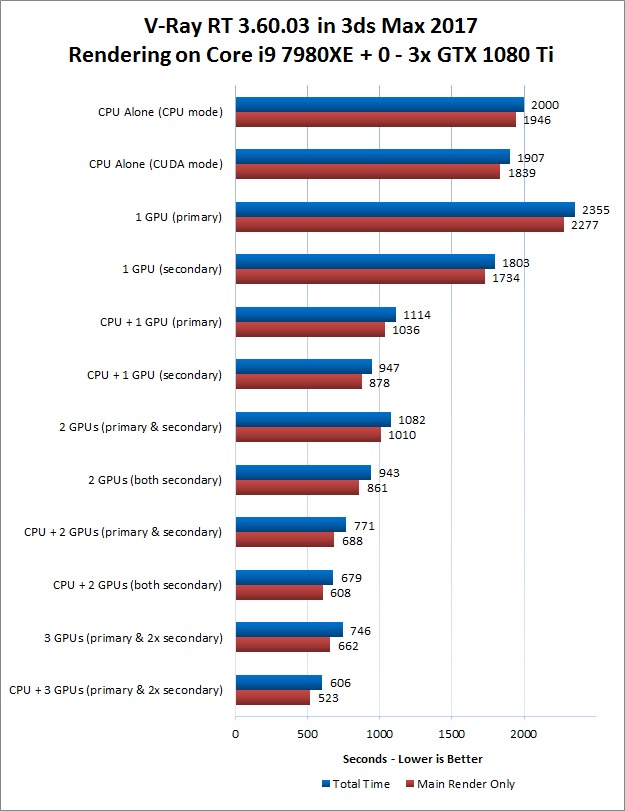 This time around the CPU has a much larger impact! In fact, the i9 7980XE alone outpaces the GTX 1080 Ti when it is running as the primary video card… and it isn't far behind the same GPU when used as a secondary card (no video output). Consequently, it also has a much bigger impact on performance when used in combination with the video cards. At the top end, with three 1080 Ti cards, including the 18-core processor reduced render times by more roughly 20%.