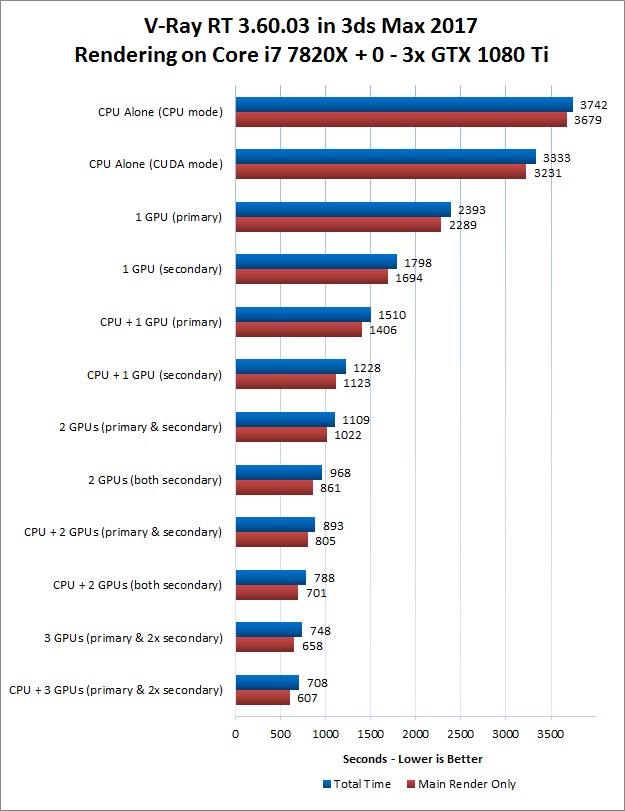 - The i7 7820X is not as fast as a GeForce GTX 1080 Ti when it comes to rendering in V-Ray RT, but it does give better performance when in CUDA mode than when in the normal CPU mode (a setting that can be selected within V-Ray RT's render configuration options).