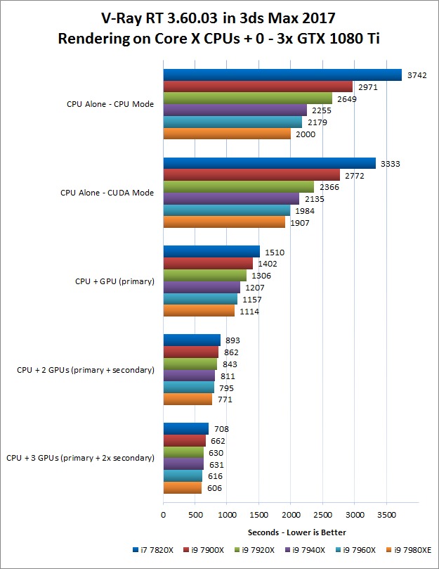 There is a great blog post about this from Chaos Group themselves, if you want more insight into how and what they did – but they only provide a couple of limited performance examples. To augment that information, we have tested a slew of Intel Core X (Skylake-X) series processors with up to three GeForce GTX 1080 Ti video cards – to see how much of an impact adding the CPU has on performance with different numbers of GPUs. If this information is helpful to readers, we may test additional configurations in the future… so please let us know in the comments!