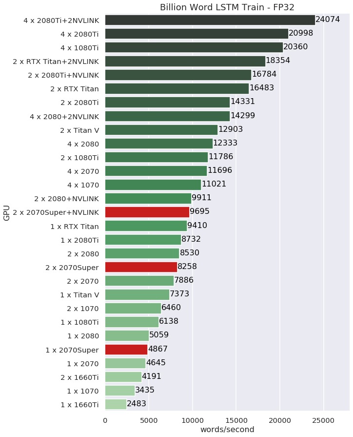 With this recurrent neural network there is more GPU-GPU communication so NVLINK has more impact. The 2 x 2070-Super + NVLINK configuration did a little better than a single RTX Titan.