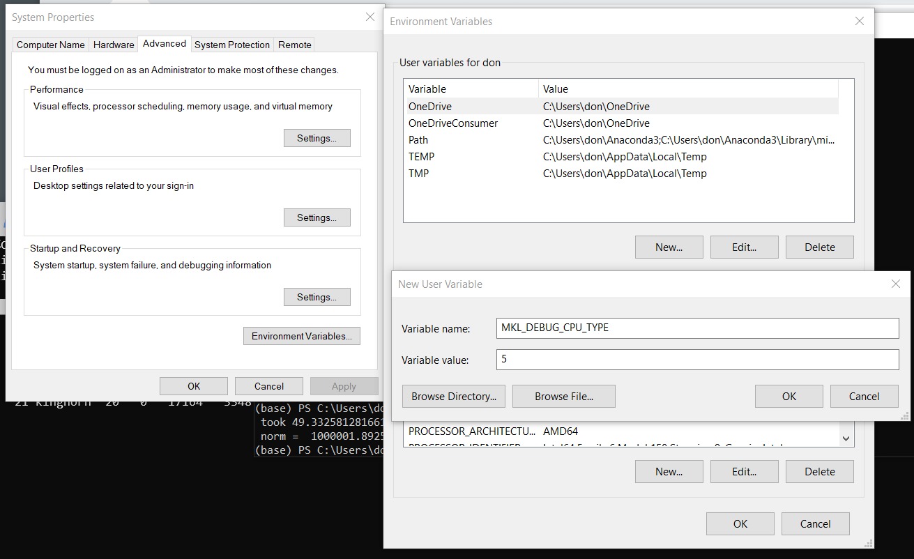 We will set a DEBUG environment variable for Intel MKL that forces it to use the AVX2 vector unit on AMD CPU's (this will work for other applications too, like MATLAB for example.) … but please see "BIG Caveat!" at the end of this post.