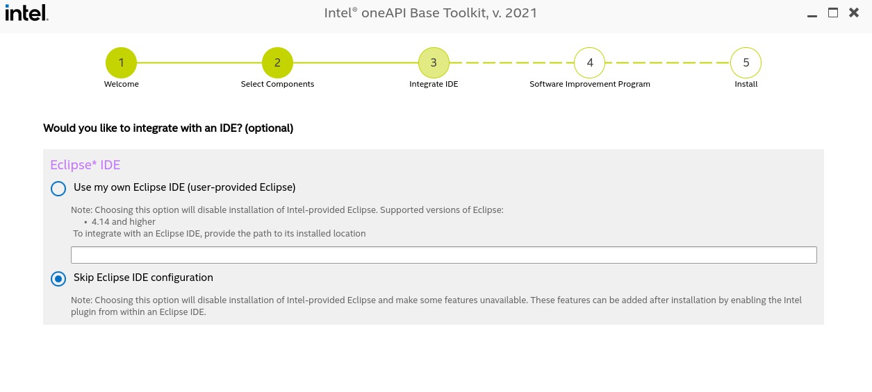 Note: On Windows and macOS I believe this is where you would have the option to integrate with Visual Studio or Xcode (Visual Studio install is required for oneAPI on Windows.)