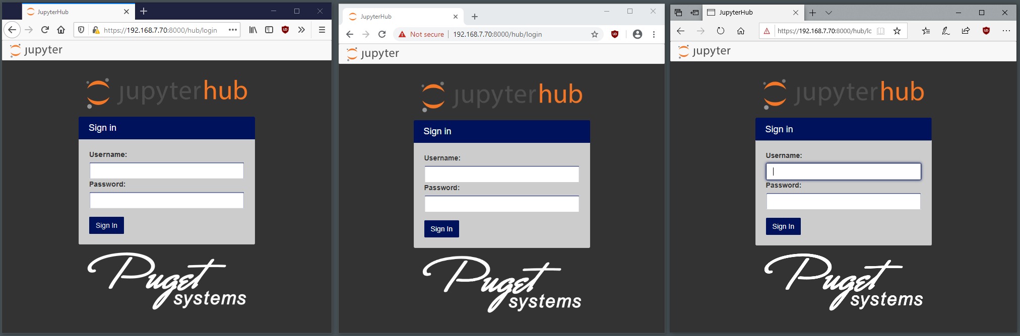 You can now access JupyterHub at https://(address-for-jhub):8000 Traffic between your browser and the server will be encrypted.