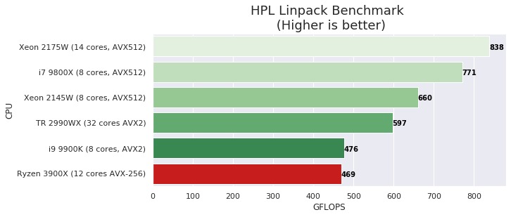 The following plot shows HPL Linpack results (in GFLOPS) for the Ryzen 3900X and a few other CPU's that I have recently tested.