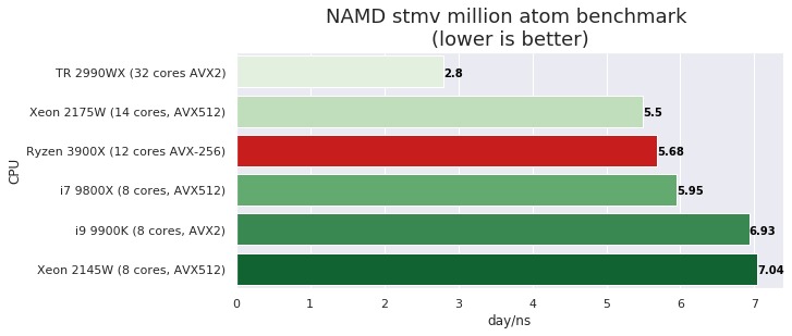 This plot show the performance of a molecular dynamics simulation on the million atom "stmv" ( satellite tobacco mosaic virus ). These job runs are with CPU only. Performance is in "day/ns" (days to compute a nano second of simulation time).