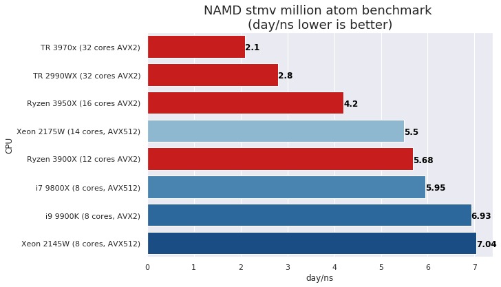 This post revisits the recent Ryzen posts and adds in new results for the Threadripper 3970x I'm including NAMD Molecular Dynamics results for my usual test molecule, STMV as well as a smaller molecular system, ApoA1. ApoA1 seems to be a popular system for benchmarking on CPU with NAMD. GPU acceleration results are reported for the ApoA1 job results.