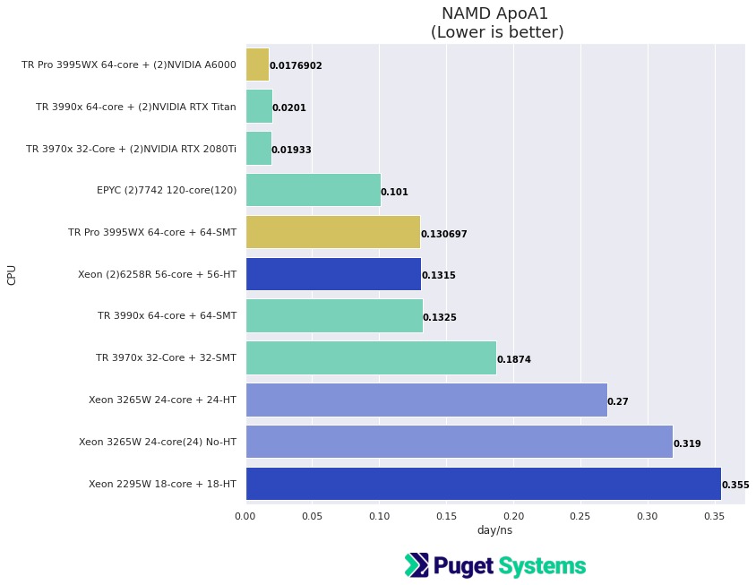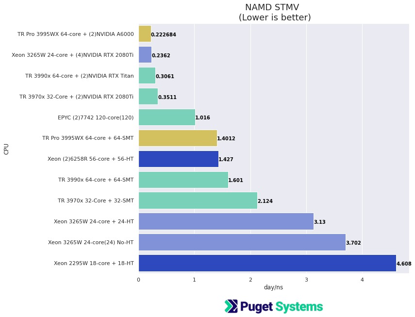NAMD also has very good GPU acceleration! (There are a few GPU accelerated results in the charts. Note that NAMD requires good balance between CPU capability and GPUs)