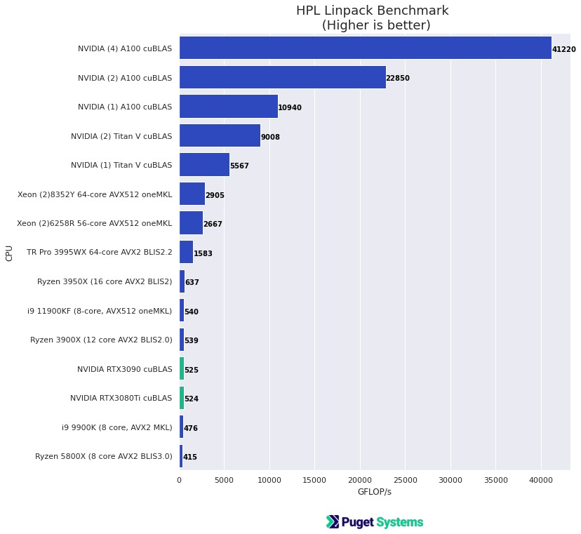 - The results from the HPL-AI are sensitive to the problem size, larger problems usually give better performance. The RTX 3090 results in this chart is using the same problem size as the RTX 3080Ti. This is because at larger problem sizes the 3090 failed residual error criteria the same way the single A100 did. I had hoped this would be a place where I could show the potential performance advantage of the 3090s extra memory. I have included some of the job output in an Appendix at the end of the post.