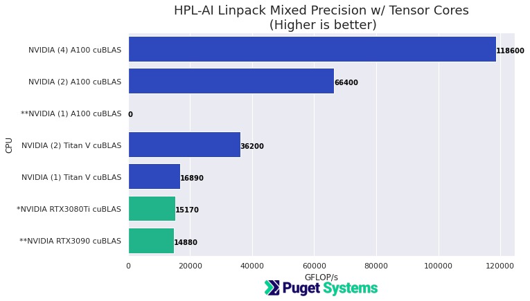 - HPL-AI: Mixed Precision Benchmark Is the same HPL benchmark but using lower/mixed precision that would more typically be used for training ML/AI models. On the A100 this utilizes TF32, 32-bit Tensor-Cores. This benchmark is now also part of the Top500 supercomputer rankings.