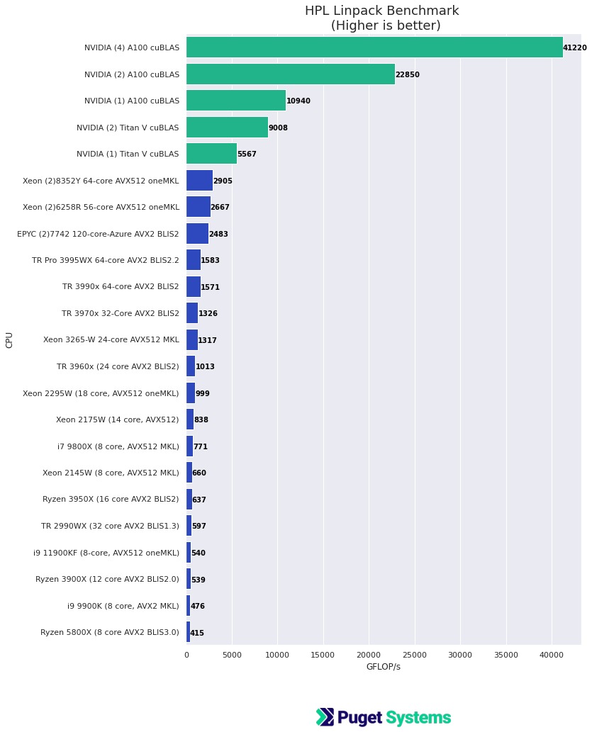 Keep in mind these are "Benchmarks"! I made an effort to find (large) problem sizes and good parameters that would showcase the hardware. Measured GPU performance is particularly sensitive to problems size (larger is generally better). For the GPUs I have used NVIDIA's optimized "NVIDIA HPC-Benchmarks 21.4" container from NGC. That is their Supercomputer benchmark set!