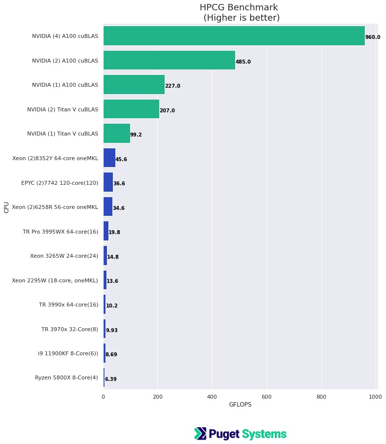 HPCG stresses memory/IO-communication performance. This is a (another) place where GPUs give great performance. The 4 x A100 achieves nearly 1 tera-flop per sec.. This is a massive increase over even the best CPU based system I have ever tested. Memory-bound code should run very well on A100!