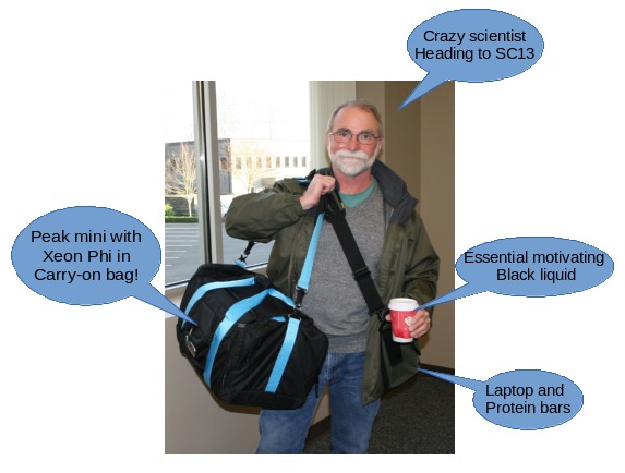 On the way back to Seattle from Denver they did ask me to open the bag but when I explained that I had been at Super Computing 2013 (SC13) exhibiting this little beauty at the Intel booth the fellows eyes turned from suspicion to pleasant interest. When I told him it had an Intel Xeon Phi in it and could do a tera-FLOPS in double precision he knew what I was talking about and just said "really cool!". That, by the way, was the phrase I heard from nearly everyone who looked at the Peak mini at the SC13 conference.