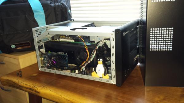The kind folks over at NVIDIA have sent us a couple of Tesla K40's for testing and system validation and I'm waiting on a license key for PGI Workstation. Of course the first system I've dropped a Tesla into is the Peak Mini. Here's a couple of photos (lousy ones, taken with my cell phone in bad light). I put a Tesla K40 in a Peak Mini and popped it into it's carrying bag and sneaked it out of the office so I could spend some quality time at home this weekend with the K40! Also, as a hopeful teaser, we have been encouraging (and been encouraged by) NVIDIA regarding a very nice "starter kit" for newly registered Tesla developers that would encourage a new round of developers who may have been reluctant to dive into the CUDA waters in the past. With new hardware, programming tools and libraries in hand those developers may find the waters much more inviting these days!