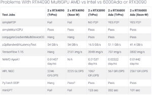 I was prompted to do some testing by a commenter on one of my recent posts. They had concerns about problems with dual NVIDIA RTX4090s on AMD Threadripper Pro platforms. I ran some applications to reproduce the problems reported above and tried to dig deeper into the issues with more extensive testing. The included table below tells all!