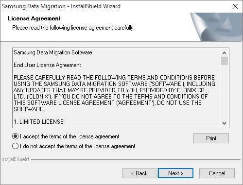 7) Once successfully installed and launched, the 'Start' page for the Samsung Data Migration Software looks like this: