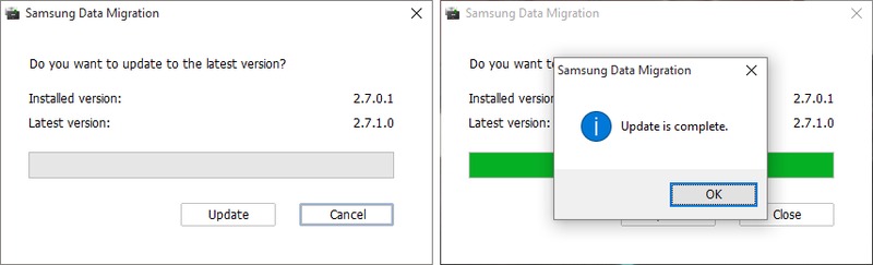 5) Once the installer completes, it will automatically run the Samsung Data Migration Software. The first thing it does is check to see if a newer version is available, and if so it offers the option to upgrade. It is generally best to use the latest version, so if there is an upgrade available click on Update: