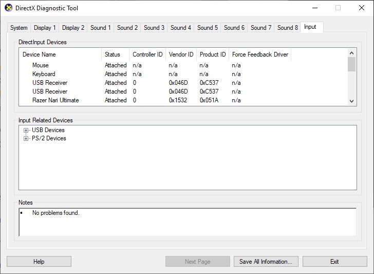 The Input tab shows each currently detected input device, their status, controller, vendor/product ID and Force Feedback status. Within the Input Related Devices section you can expand each section and review relevant devices. Problems will also be listed in the Notes section at the bottom.