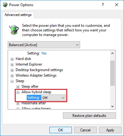 - Click the + sign next to “Allow hybrid sleep” and change setting to “off”