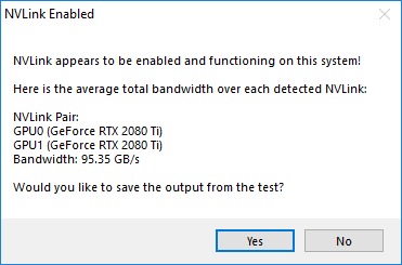 However, as of the time we are publishing this, there is no easy way to tell if NVLink is enabled and functioning within Windows 10. Further, the way to enable NVLink is different depending on what sort of video cards you have. We have put together this guide to help: covering the different ways to enable NVLink, along with a small utility to easily test and make sure it is working as expected.