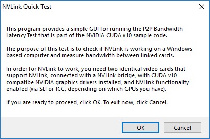 We have compiled one of those sample programs and put together a simple GUI to make it easy to run in Windows 10. Just click the Download button below, save the linked ZIP file, and extract its contents. Inside you will find three files: a Readme.txt, NVIDIA’s p2pBandwidthLatencyTest.exe, and our NVLinkTest.exe. Run that last program and it will report whether NVLink is working or not.