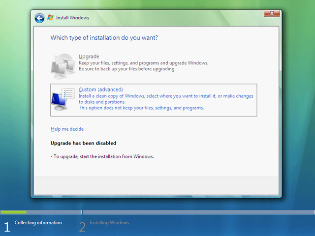 | Choose whether you are upgrading from a previous Windows installation to Windows Vista. If you are installing a fresh installation of Windows Vista, select the Custom option. |