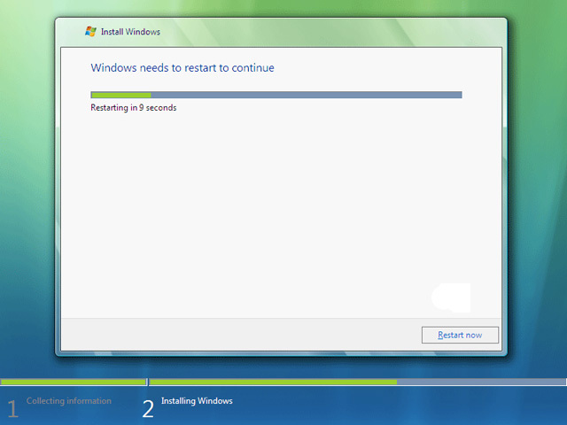 | Setup has finished installing key components of the Vista operating system, and is now preparing to load Windows Vista for the first time to start the next phase of the installation process. |