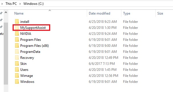 Open the 'C' drive, often named 'Local Disk'. In here you will find a folder named 'MySupportAssist'. Right click this folder and select 'Delete'.