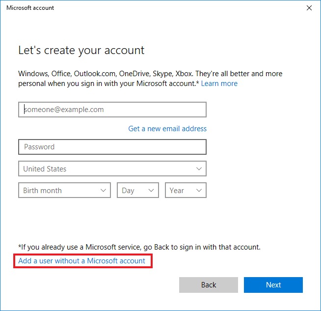 5. Microsoft will try to help you create a Microsoft account but we are going to click “Add a user without a Microsoft account” instead