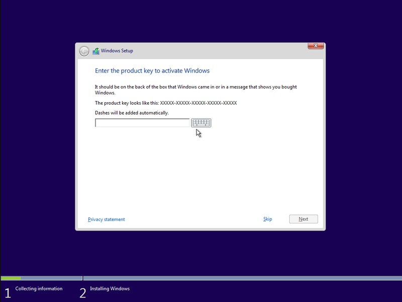 This part will differ depending one which version of Windows you install. The product key page may come later during the install if you're installing earlier versions of Windows. Regardless, when you get it, just type the key in. It'll be on a label on the back or bottom of your computer if you bought your copy of Windows from us. It will also be listed on the second page of the white binder that came with your system. You can skip it if you'd like, but eventually you will have to put the product key in, so might as well do it now. Click "Next".