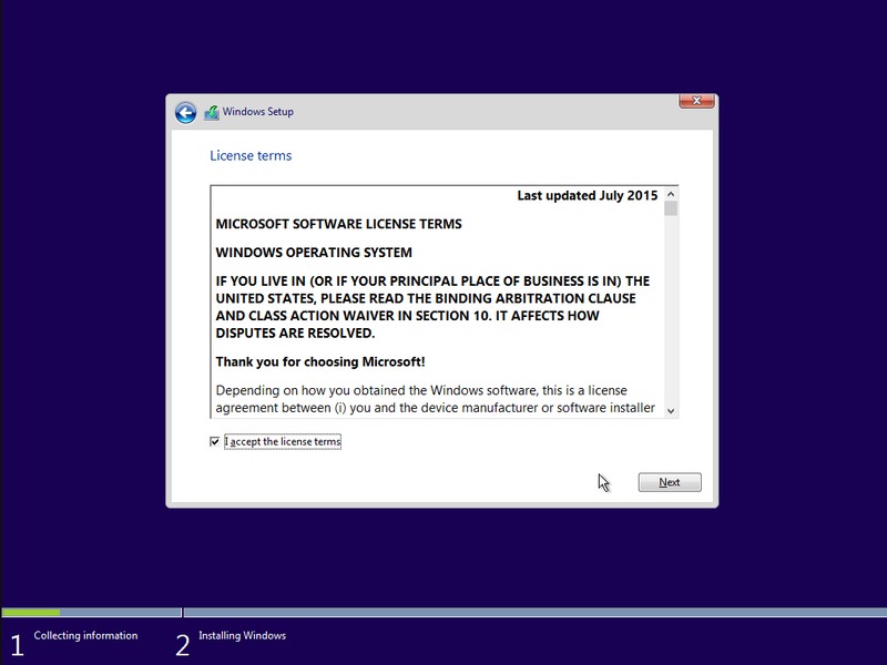The next screen is Licensing terms. Go ahead and accept it. Microsoft isn't exactly going to take no for an answer.