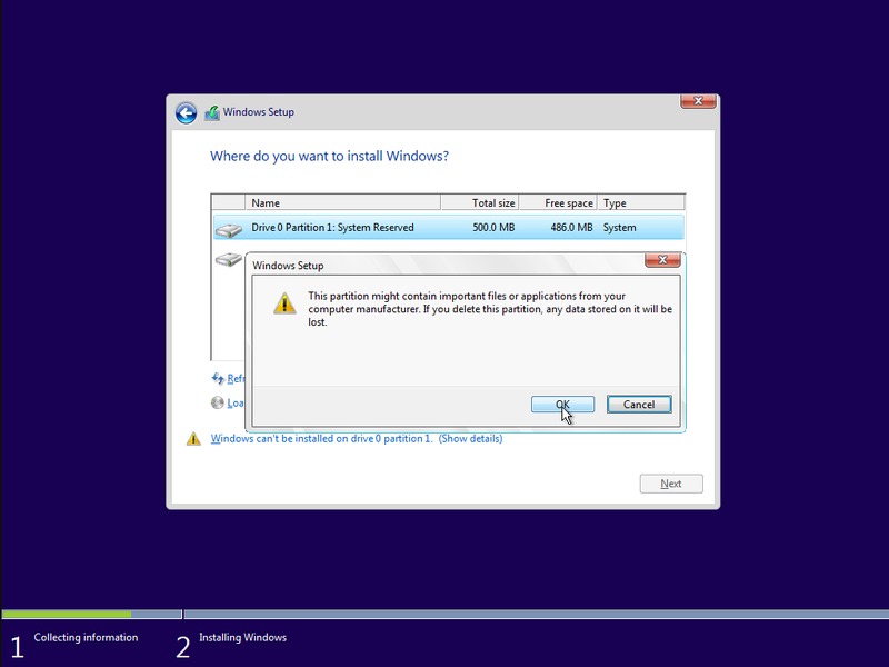 That all said, click on the System Reserved drive and click "Delete". Then do the same for the other partition on your primary drive. Both times, you'll be given the prompt below, basically repeating what I just mentioned regarding losing data.