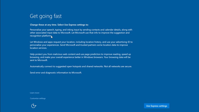 You can select "Use Express settings", but I typically click the "Customize settings" option. You'll get a couple of pages of different privacy settings. I typically leave most of them on, but if you're worried about your privacy, you might consider disabling some or all of them. Note that they're typically tied into particular features of Windows. If you plan to use Cortana or any features that require an Internet connection, you'll probably need to leave those options on.
