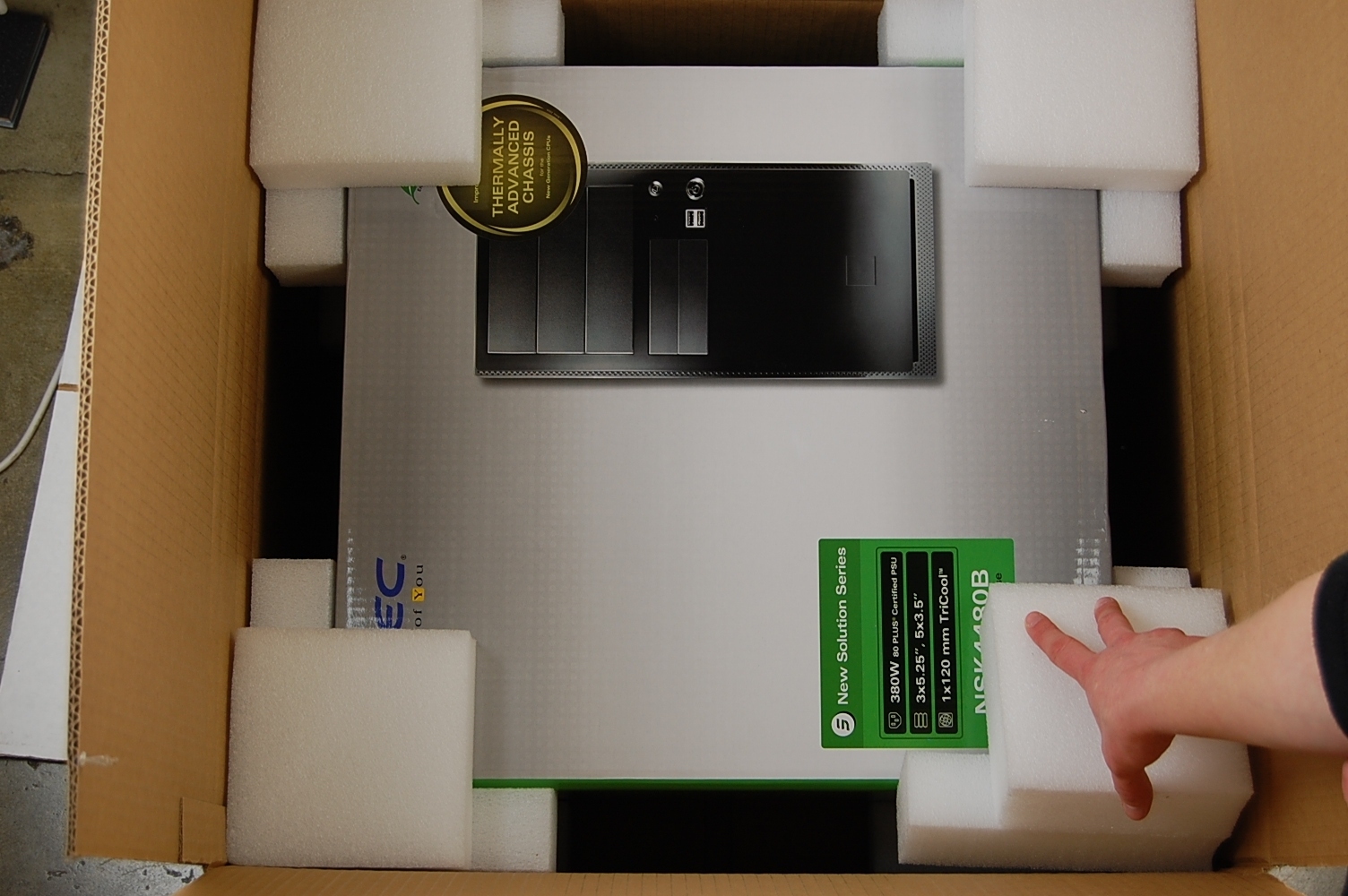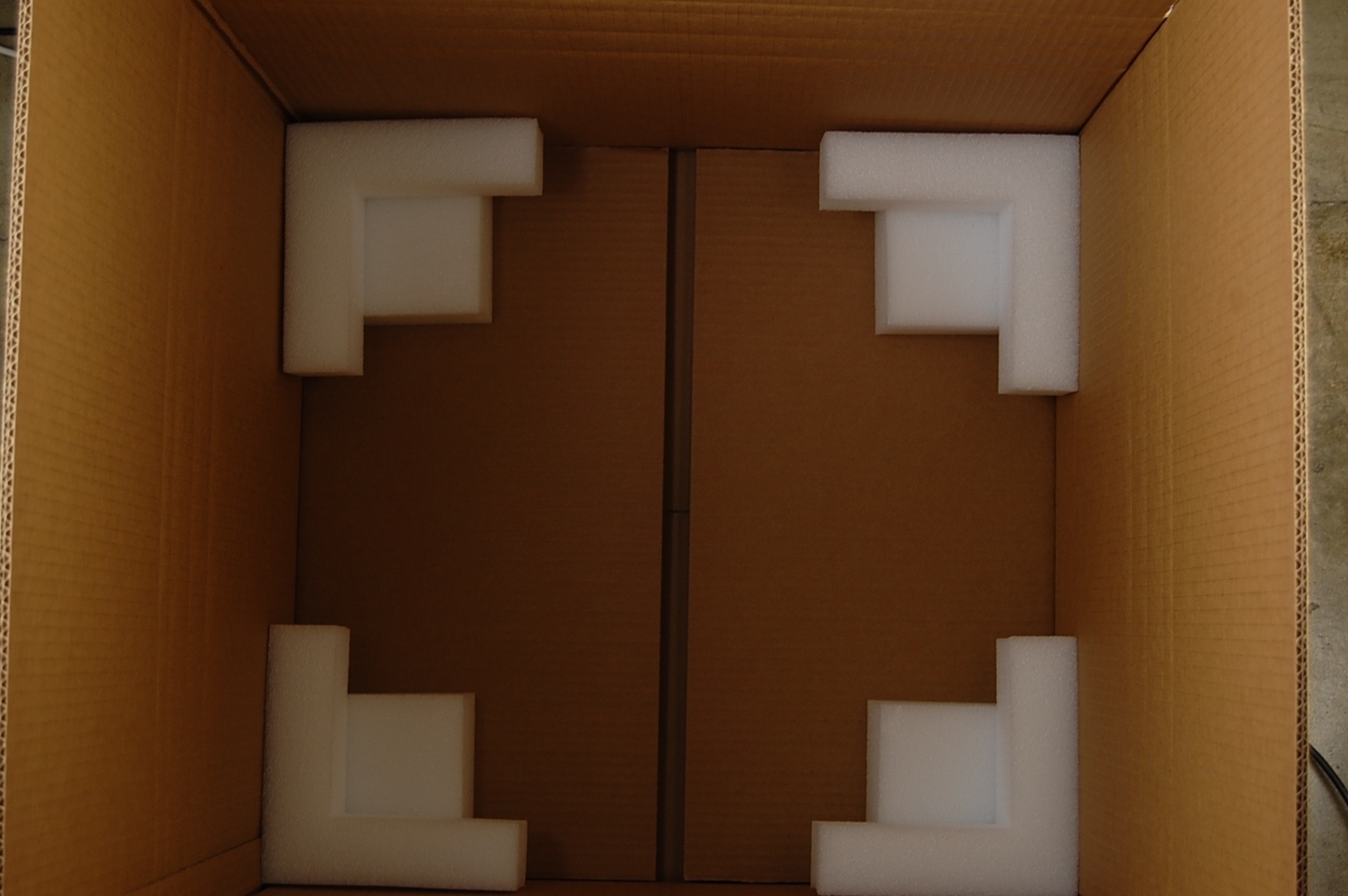 Put four foam corners in each corner of the outer box, making sure that the “L” side of the corner is facing up. As you lower the computer into the box, make sure the motherboard side is down (the main picture will be facing up).