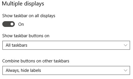 Some of these behaviors can be changed in the Multiple Displays section of the Taskbar settings window. You can access this window either by searching for "taskbar" (no quotes) in the start menu, or by right clicking the taskbar and selecting Taskbar settings.