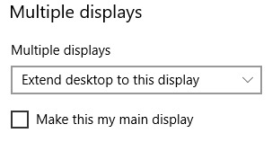 The options here are set per display as well, and in most cases “Extend desktop to this display” is the option we are looking for. We can also choose to duplicate our screen instead of extending the desktop, or to disable a display altogether.