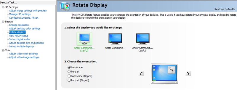 Something to keep in mind is that you cannot rotate your displays between landscape and portrait mode from within the multiple display configuration page. To rotate your monitors, click on the "Rotate display" option in the left side pane. Simply select the monitor you would like to rotate, and choose the orientation you prefer.