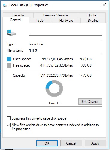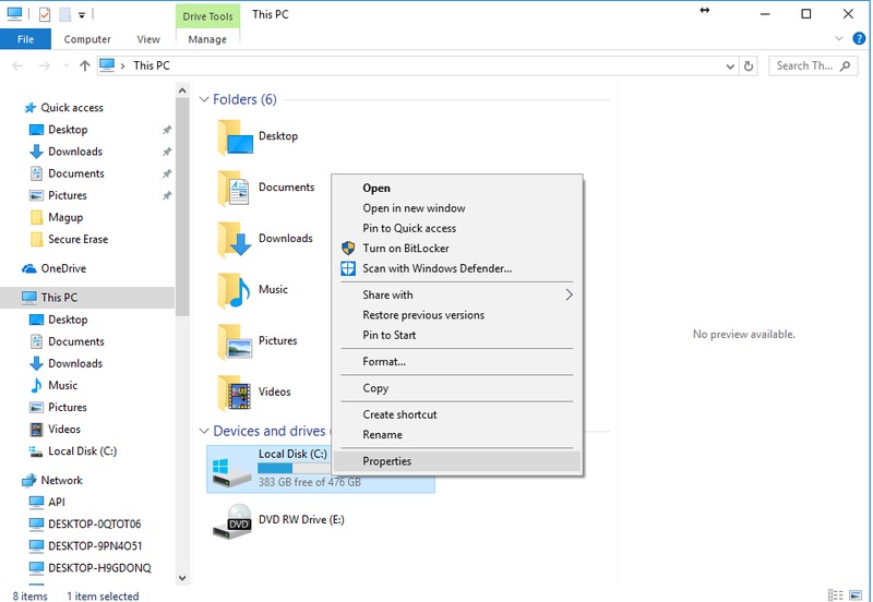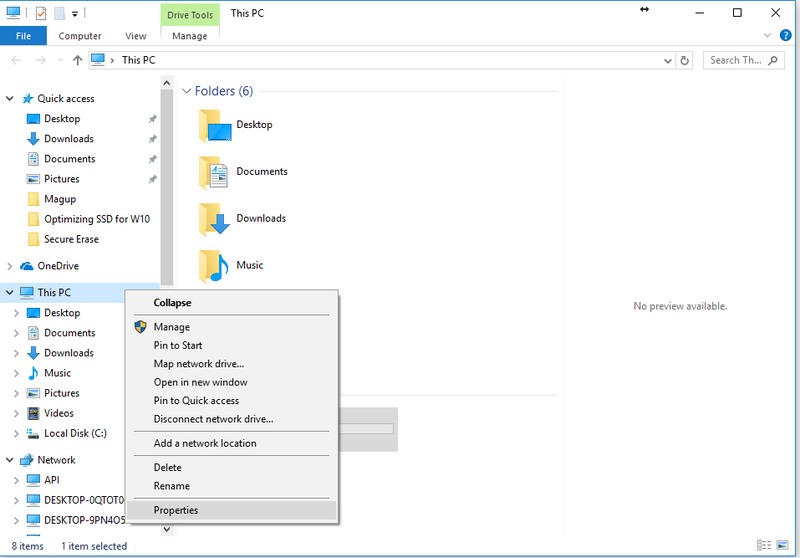 Open file explorer and select “This PC” then right click “Local Disk (C:)” and select “Properties” from the drop down menu.