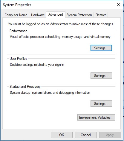 In the new windows navigate to the “Advanced” tab and click the “Change” listed within “Virtual memory” section.