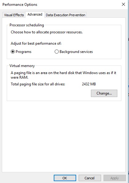 A new window will appear listing paging file size for each drive and is likely set to “Automatically manage paging file size for all drives” at the top, uncheck this box.