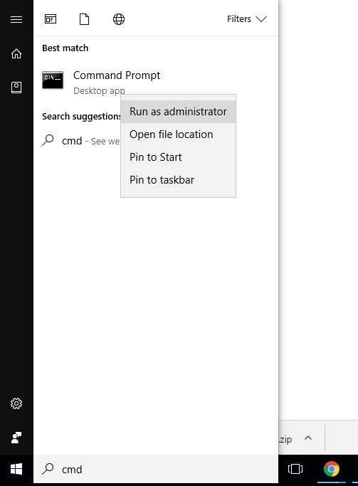 Open an elevated command prompt by clicking the “Start Menu” then typing “CMD”, right click the first result and select “Run as administrator”.