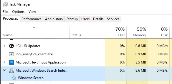 First, check if you have Windows Search service running from your Task Manager: Look for Microsoft Windows Search Indexer in the list, then expand using the small arrow to find Windows Search.
