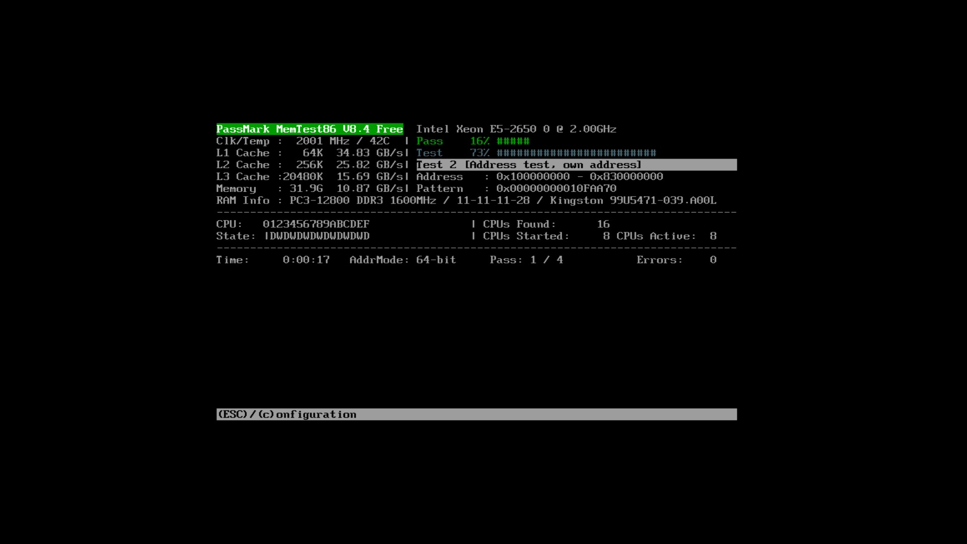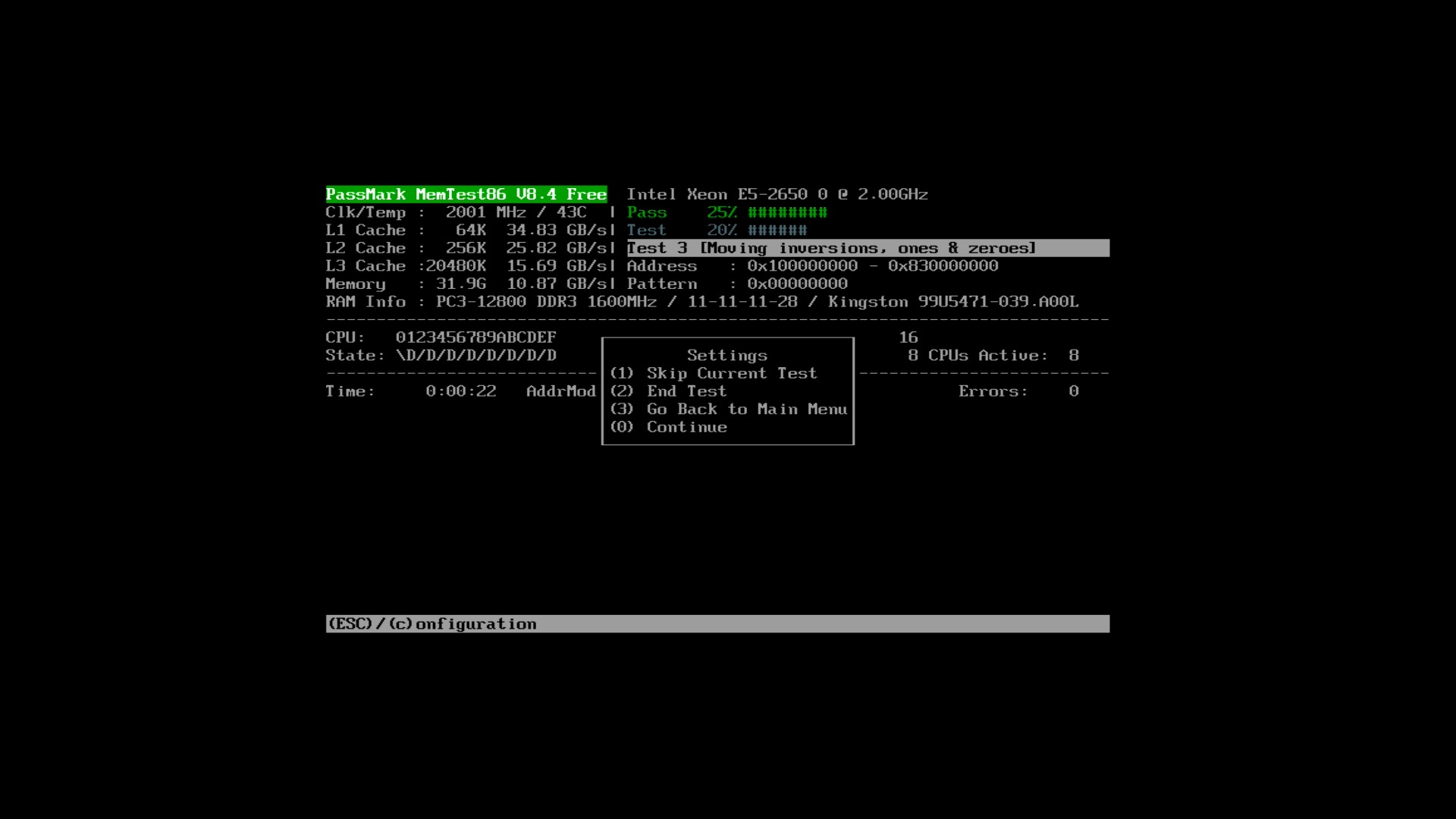 We recommend allowing MemTest86 to run a full scan regardless of how long it takes. On systems with more than 64gb of RAM it can take more than an overnight stint, but it's worth it to let MemTest86 run as many passes as it needs. If you need, you can hit the ESC key to exit early and reboot the machine into Windows (remove the USB).