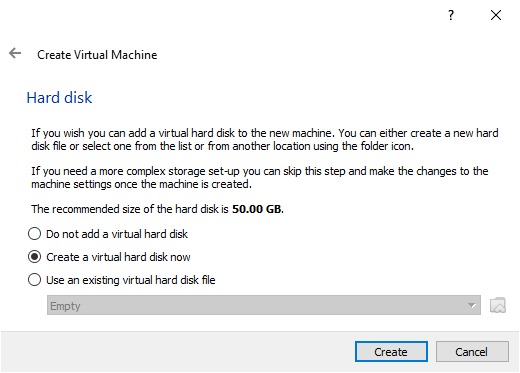 - You can create a new, empty virtual hard disk, click the Create button