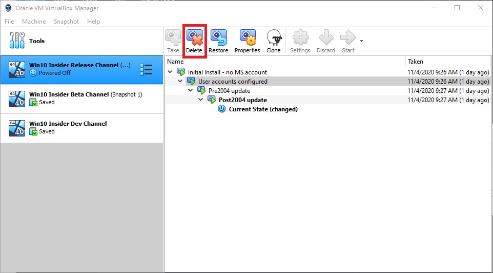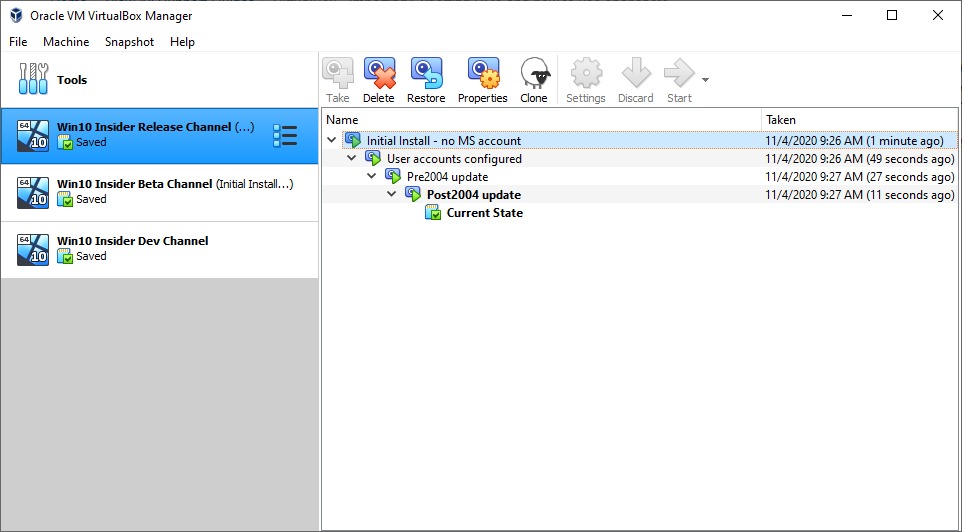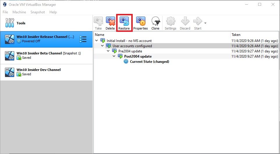 VirtualBox snapshots are a powerful and easy to use feature that allows you to save a VM in it’s current state for use at a later time. At any point in the future you can restore the VM to this state no matter how much the VM has changed since the snapshot was taken.