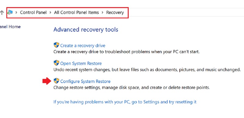 Control Panel > All Control Panel Items > Recovery > Configure System Restore