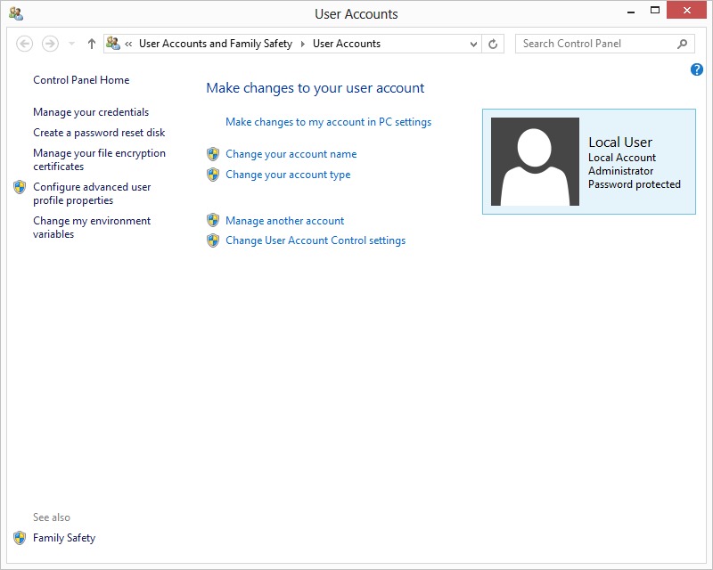 Accessing Control Panel -> User Accounts. Once you have done so, follow the steps below to access the advanced options for an account.