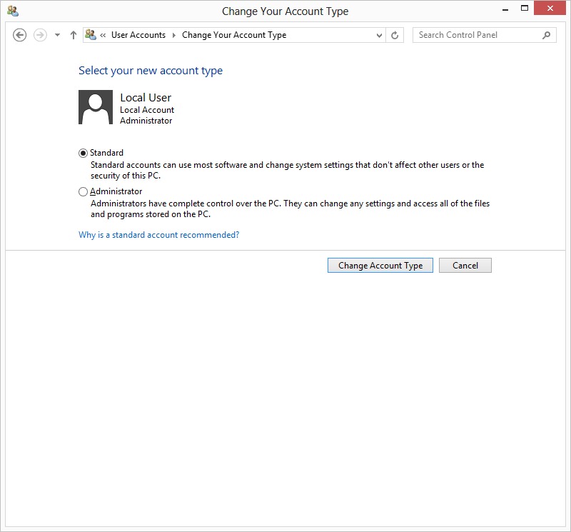 Adding user accounts, changing passwords, and editing other user settings is something that has to be done on any computer system, and can be a bit complicated in Windows 8. In Windows 8, there are now three different places to change user settings. To make things even more complicated, each place allows different settings to be changed so it is likely that a user will need to visit two or even all three of these locations to fully configure a user account. Basic settings such as editing passwords and creating new users can be done through the Start -> PC Settings, but if you want to delete an account, change the account name, or change the account type you have to go through either Control Panel -> User Accounts or Control Panel -> Manage Accounts.